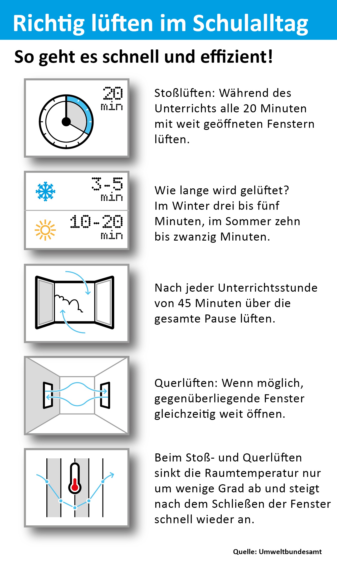 Das Umweltbundesamt (UBA) hat für die Kultusministerkonferenz (KMK) eine Handreichung zum richtigen Lüften in Schulen erarbeitet. Darin geben die Expertinnen und Experten für Innenraumlufthygiene des UBA Empfehlungen, wie sich mit richtigem Lüften in Schulen das Risiko reduzieren lässt, sich mit dem neuartigen Coronavirus zu infizieren.